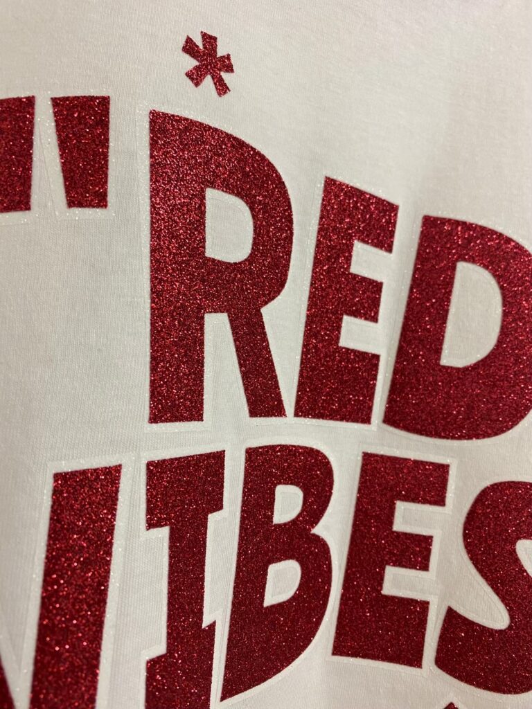 パールグリッターが散りばめられたシートを熱圧着してプリントしました。
